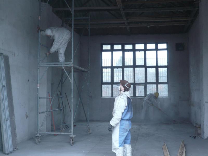 Seit vielen Wochen produzieren in Vollschutz vermummte Gestalten Berge von Schutt, Mineralwolle und Staub, volle Container werden im Handumdrehen gegen leere getauscht.