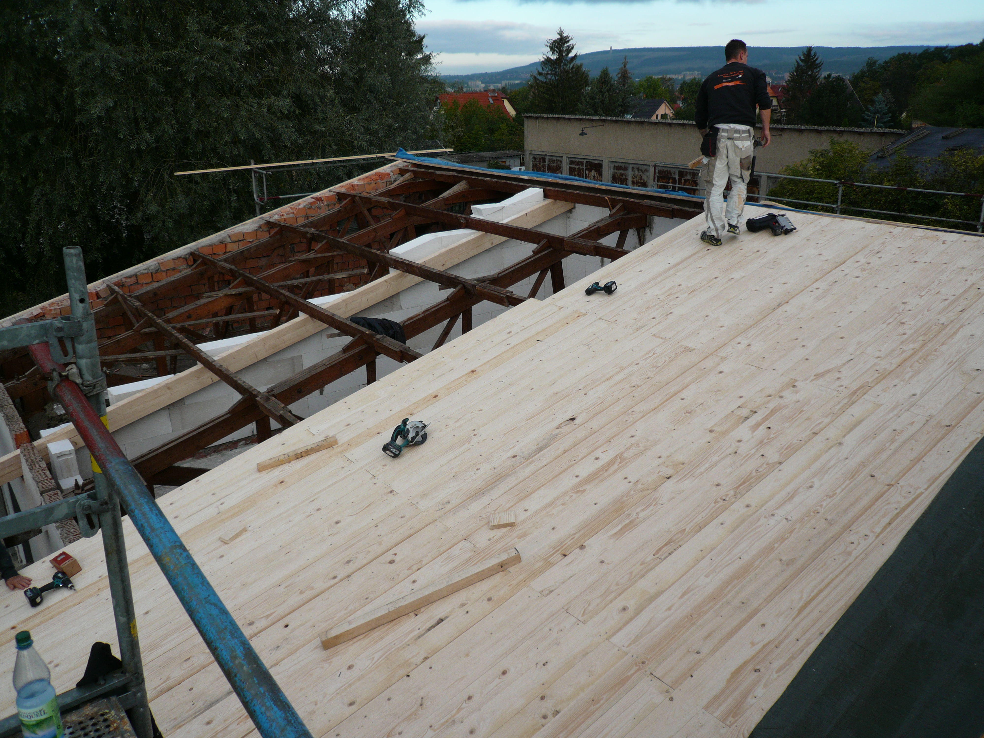 Die Wohnung des flacheren Anbaus hat schon im September eine neue Deckung auf dem vorhandenen Dachstuhl bekommen.